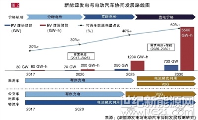 值得注意的是,《報告》發(fā)布了新能源發(fā)電與電動汽車協(xié)同發(fā)展路線圖(如圖2)。“如圖所示,可再生能源發(fā)電量占比將從目前25%提升至50%以上,電動汽車儲能理論潛力也將從目前的30GW-100GWh提升至700GW-3800GWh。”劉堅強調(diào),在不同時段引入合理的價格機制和并網(wǎng)模式是發(fā)掘電動汽車儲能潛力的關(guān)鍵。